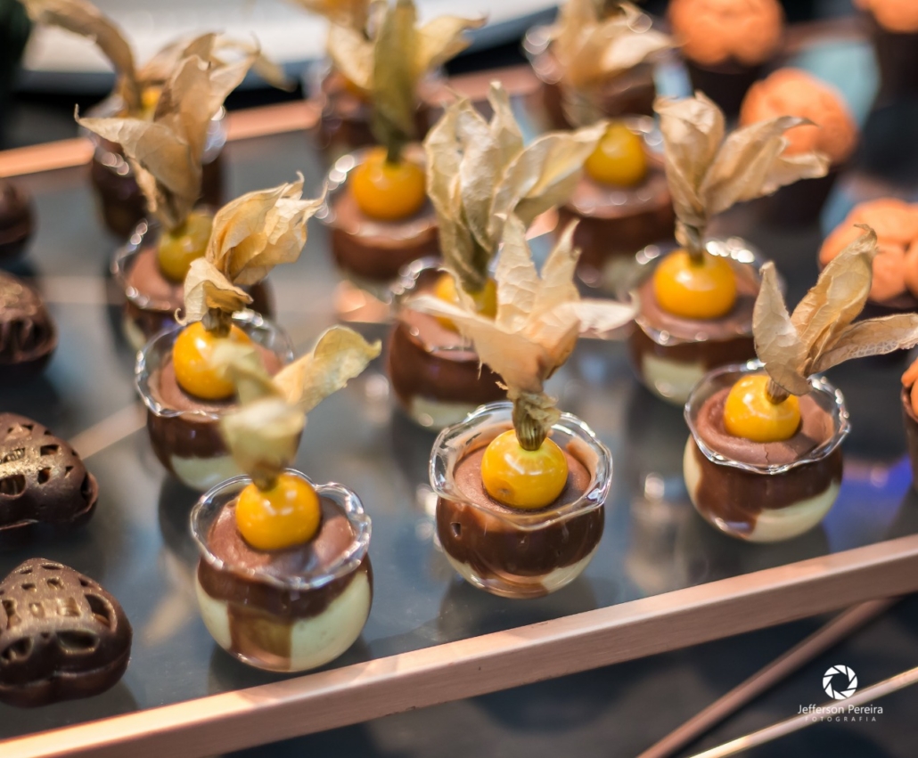 Um pequeno vidrinho que guarda brigadeiros gourmet de chocolate preto e branco, combinados com a riqueza do physalis. Cada detalhe transforma este doce em uma criação minuciosa e escultural, onde textura e sabor se encontram com sofisticação.